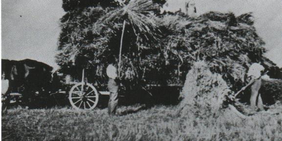 Mit Sensen wurde vorgemäht, um "Fahrrinnen" für die Selbstbinder zu schaffen, die wohl jeder Bauer hatte. Das Getreide wurde, wenn es in den Stiegen getrocknet war, zusammengefahren und in Scheunen oder