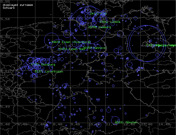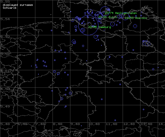 besondere Konzerntration zu beobachten. Zusätzlich lässt sich eine Schwerpunktbildung in NRW erkennen. Zu vermuten ist, dass die Vertreibung der SCHWARKs aus Ostpreußen zu einer neuen regionalen